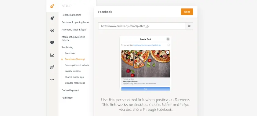 Vi har däremot en smidig lösning på detta problem: Vi ger dig en smart länk som du både kan använda med Facebooks egen ”Köp nu”-knapp samt klistra in i dina fästa Facebook-inlägg. När potentiella kunder klickar på länken får de upp din meny i ett format som är anpassat för just deras smartphone eller surfplatta.